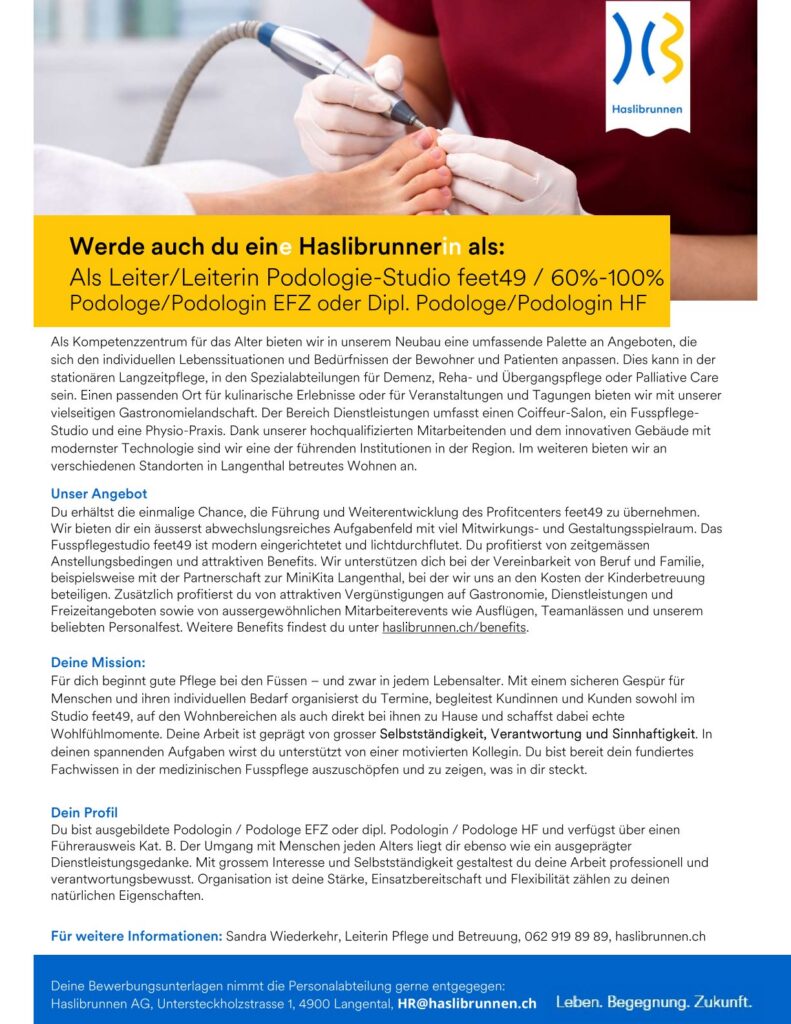 Leiter/Leiterin Podologie-Studio feet49 / 60-100% Podologe/Podologin EFZ/HF