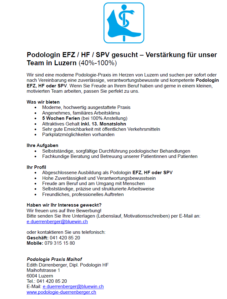 Podologin EFZ / HF / SPV gesucht – Verstärkung für unser Team in Luzern (40%-100%)